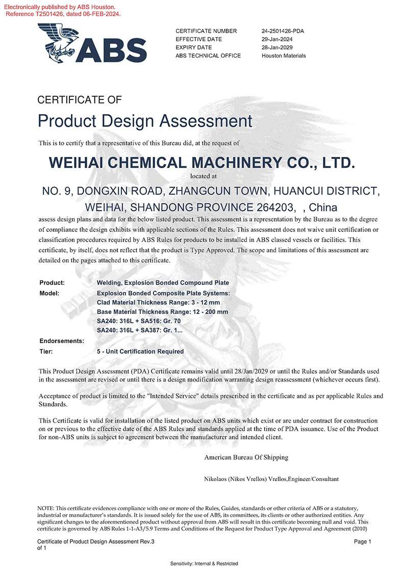 2024/04/17 查看詳情近日,威?;瘷C順利獲得美國船級社(ABS)頒發(fā)的產(chǎn)品設(shè)計PDA認可證書,認可產(chǎn)品名稱為“爆炸焊接復(fù)合板”,涵蓋產(chǎn)品種類:ASME SA264、ASME SA265、ASTM B898標準…