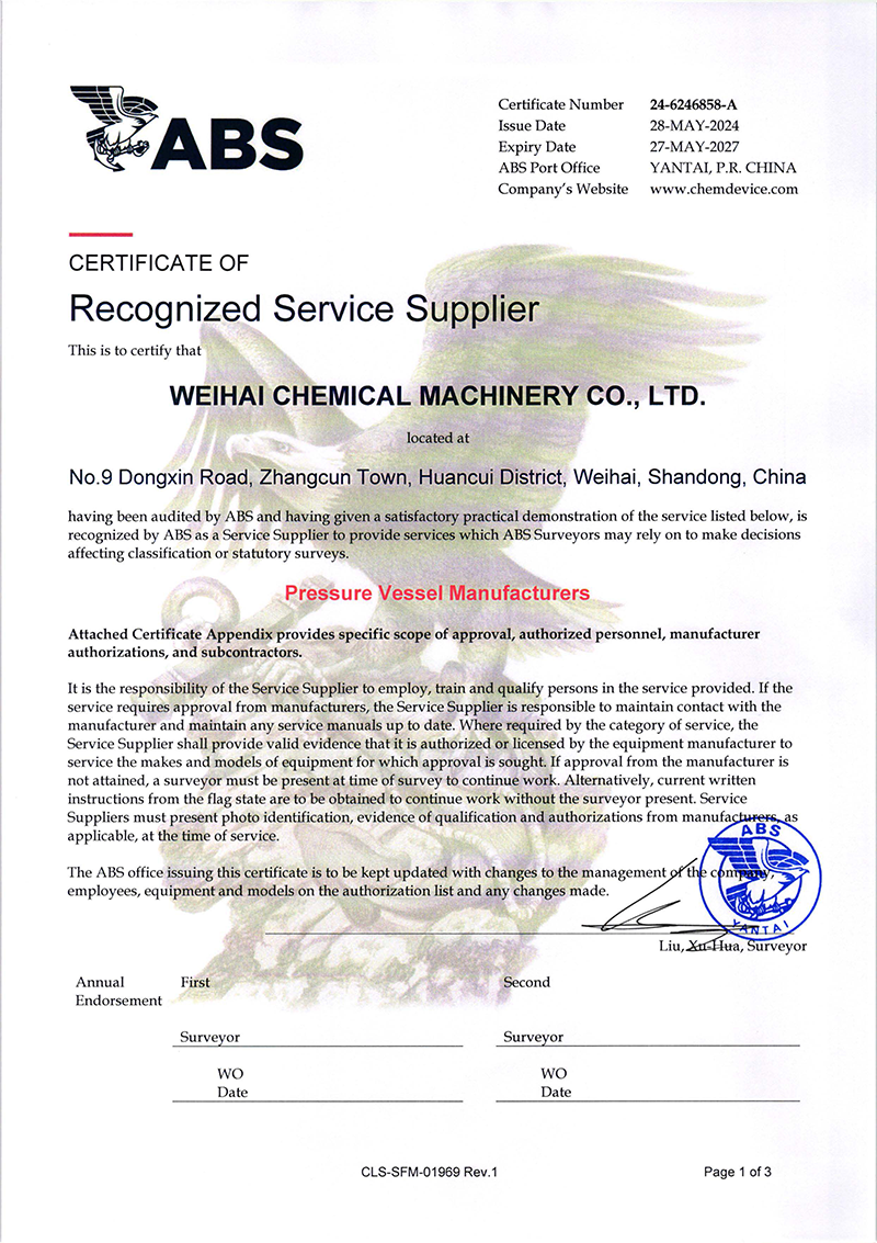 2024/09/15 查看詳情近日威?;C械有限公司(以下簡稱“威?;瘷C”)壓力容器產(chǎn)品成功獲得了美國船級社(ABS)頒發(fā)的權(quán)威認證,是繼復(fù)合板產(chǎn)品ABS認證后拿到第二張ABS證書,這標志…